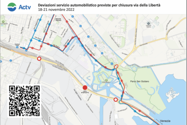 Nel periodo indicato, per raggiungere Venezia, oltre al servizio di trasporto pubblico in deviazione, si consiglia come alternativa l'utilizzo del trasporto ferroviario con tariffe integrate AVM/Actv-Trenitalia Venezia Daily Pass e Mestre Daily Pass : https://actv.avmspa.it/it/content/mobilit%C3%A0-integrata-0